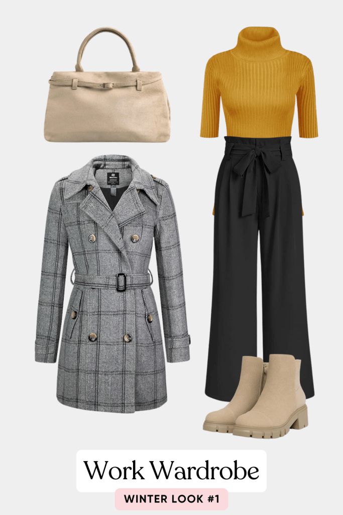 Chic, polished, and perfectly cozy for the office. This winter work look pairs a mustard ribbed turtleneck with high-waisted black wide-leg trousers for a flattering, professional silhouette. Layered with a tailored grey plaid belted coat, the outfit feels structured yet sophisticated. Neutral beige ankle boots and a matching structured handbag tie everything together for a timeless, elevated finish.